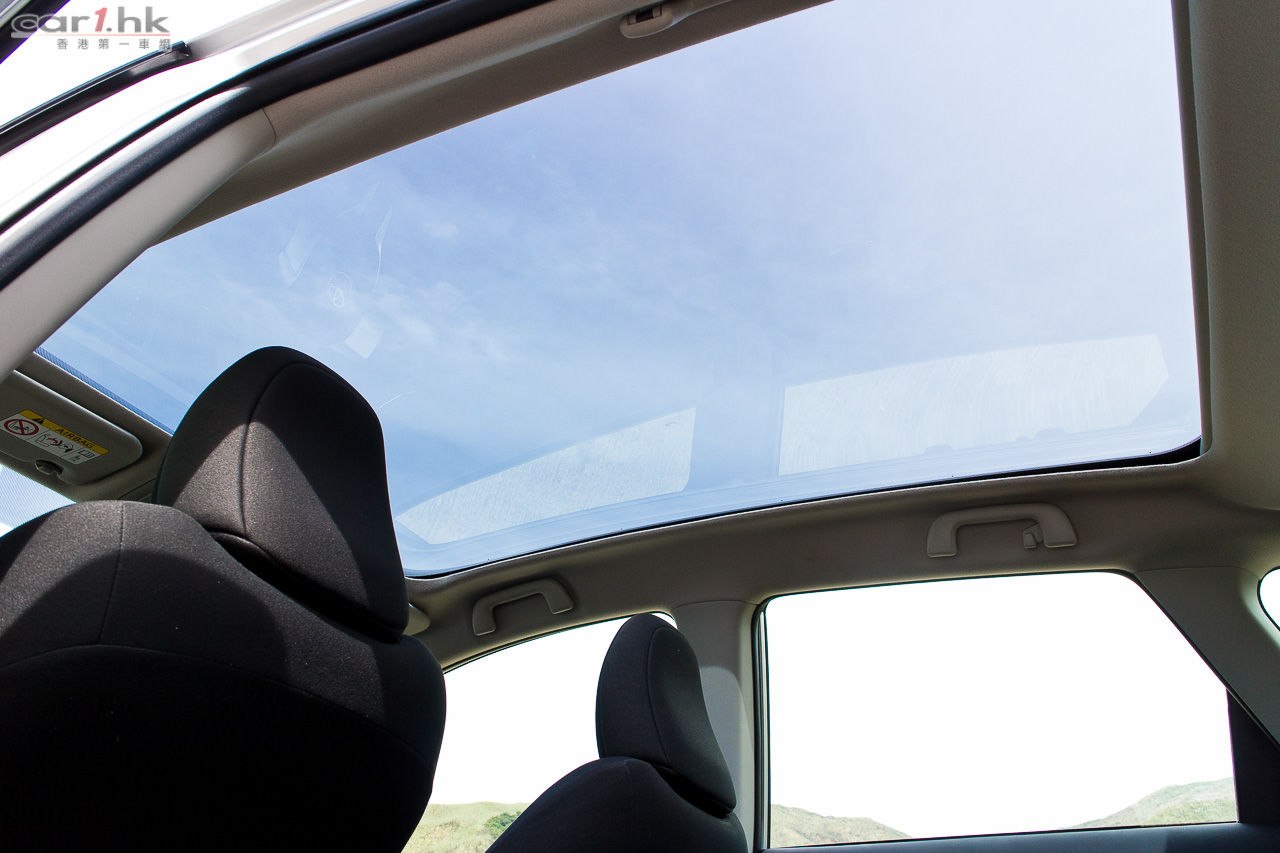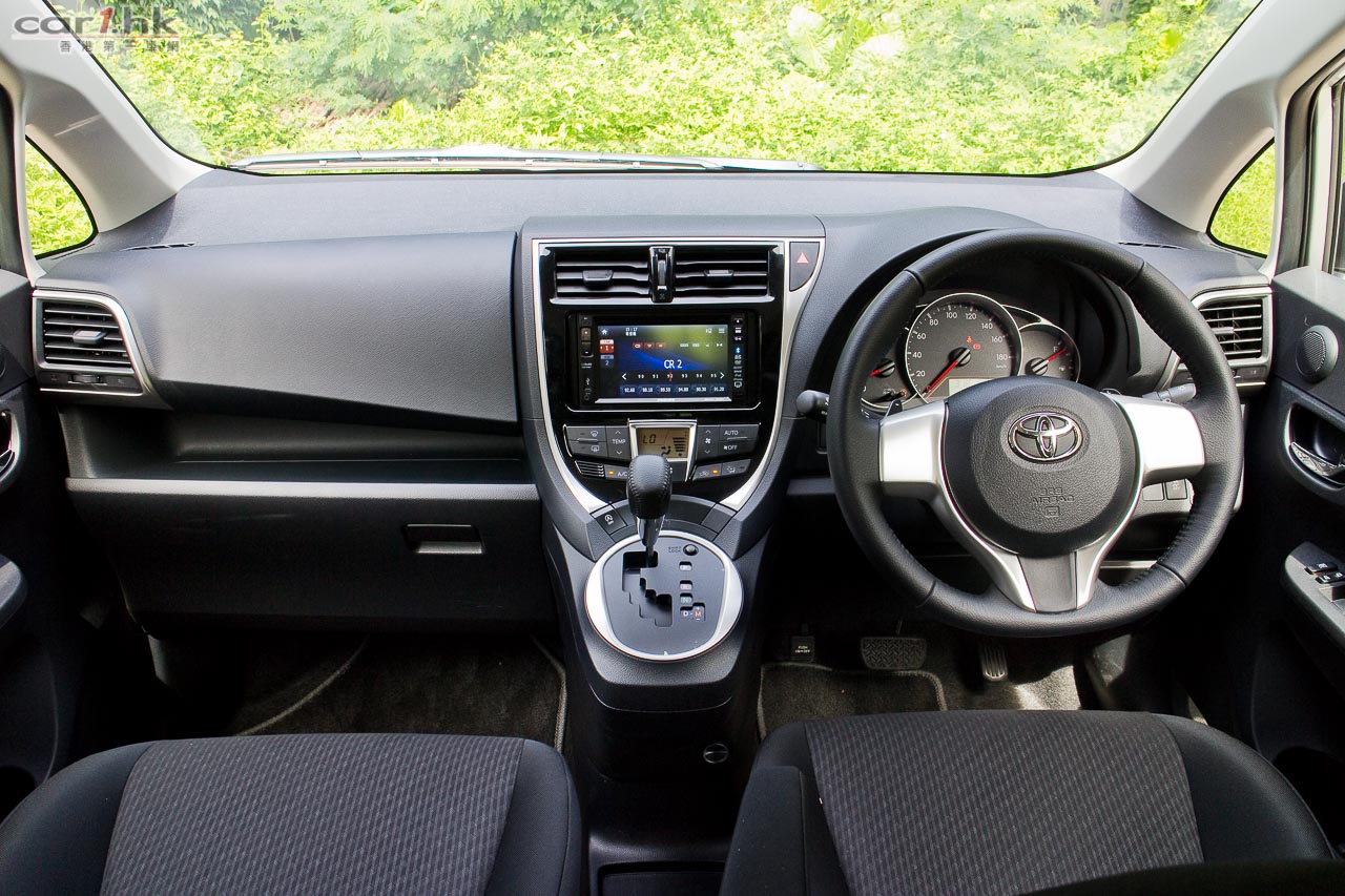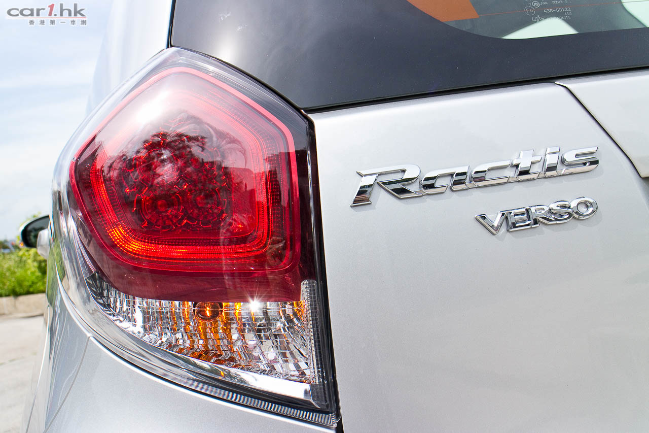 這部 Ractis Verso 屬於頂級版,而新版車頭改得最多,首先是車頭燈加入 LED 日間行車燈,照明是投射式頭燈,一大片的散光玻璃片,令到這部 Ractis 更有神。泵把亦有霧燈,算是落足料,不過霧燈罩加入電鍍飾件的話會更好看更有層次感。車頭鬼面罩入風口很薄,配上全新電鍍鬼面罩框架,很像一個小鼻子,令小改的 Ractis 多一份獨特。車尾方面,換上全新五角形 LED 光環式尾燈,尾門線條跟上代難以找出差異,遠望時仍然輕易認出它是 Ractis。進入車廂後,看見整個佈局跟過往版本一樣。簡約的中控台,設有 7 吋輕觸式 CD+USB 音響系統、真皮波棍、恆溫冷氣、軚盤轉檔撥片、前座乘客席上中下三個置物空間。車廂賣點絕對非 59 吋天幕莫屬,再加上 Ractis 車廂已經夠闊落,令到這部車空間感比其他同級車突出。