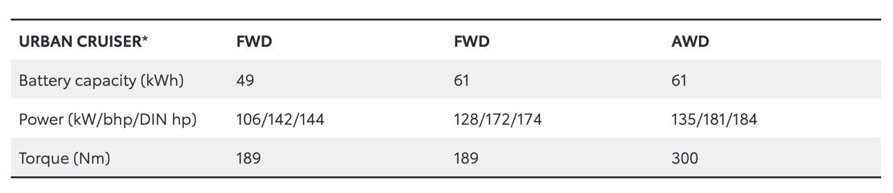 所有版本均配備熱泵冷氣系統及電池預熱功能,在寒冷天氣下仍能保持最佳效能。Urban Cruiser建基於全新電動車平台,結構強固同時輕量化,並提供更大車廂空間。此外,地台設計無需傳統橫樑,有效提升車內載物及乘坐空間。四驅版本採用Trail Mode及Downhill Assist Control功能,無論鬆散路面或崎嶇地勢都能游刃有餘,而前驅車型亦提供「Snow Mode」,助你輕鬆應對雪地。