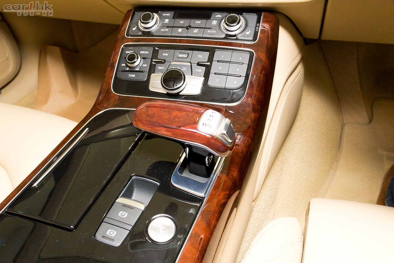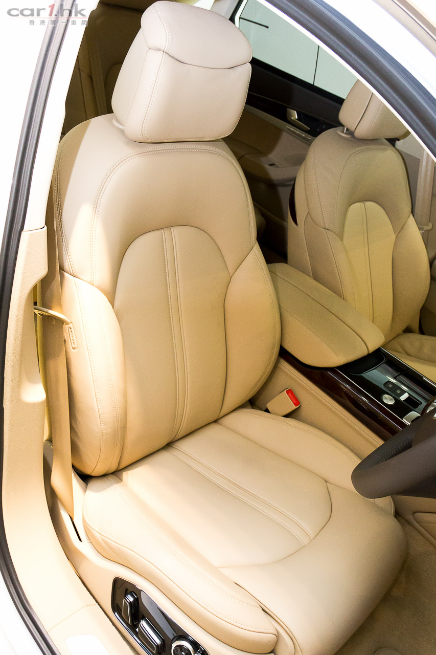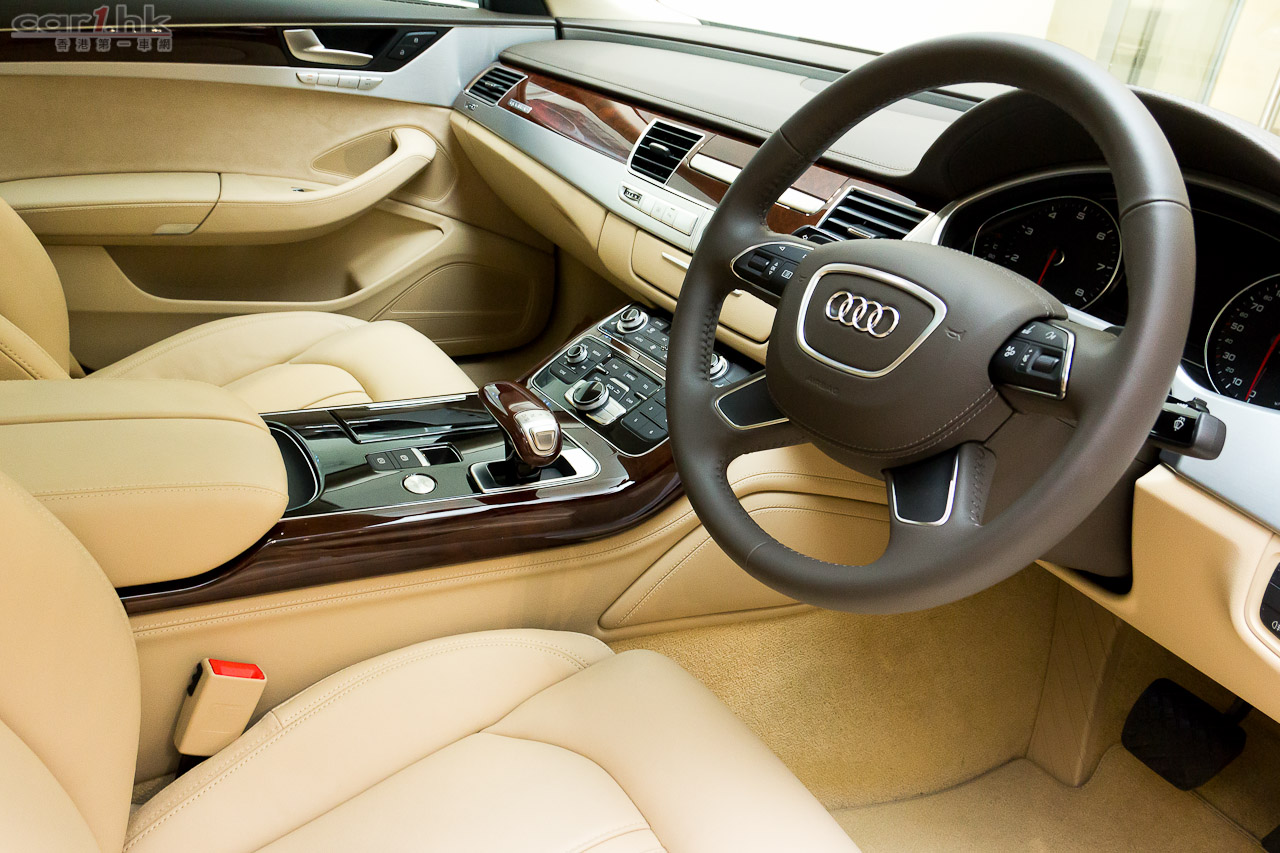 第一眼看見內籠,便可看出 A8 的設計靈感來自遊艇,首先中控台和各處的飾板皆採用大量真皮和胡桃木作裝飾,再配合極具美感的遊艇式造型波棍,就如置身頂級遊艇般。中控台具有 8 吋 MMI 多媒體系統可由旋轉按鈕快速使用功能,而下方的操作按鈕亦都伸手可及,避免行車時分心;另外,7 吋的儀錶板能夠清晰顯示各種行車資訊。全新的 Navigation Plus 導航系統可顯示 3D 立體影像。座椅方面亦都極為講究,除了用料柔軟,還有 22 向電動調整功能;後座更有氣壓式按摩功能,乘坐感舒服無比。