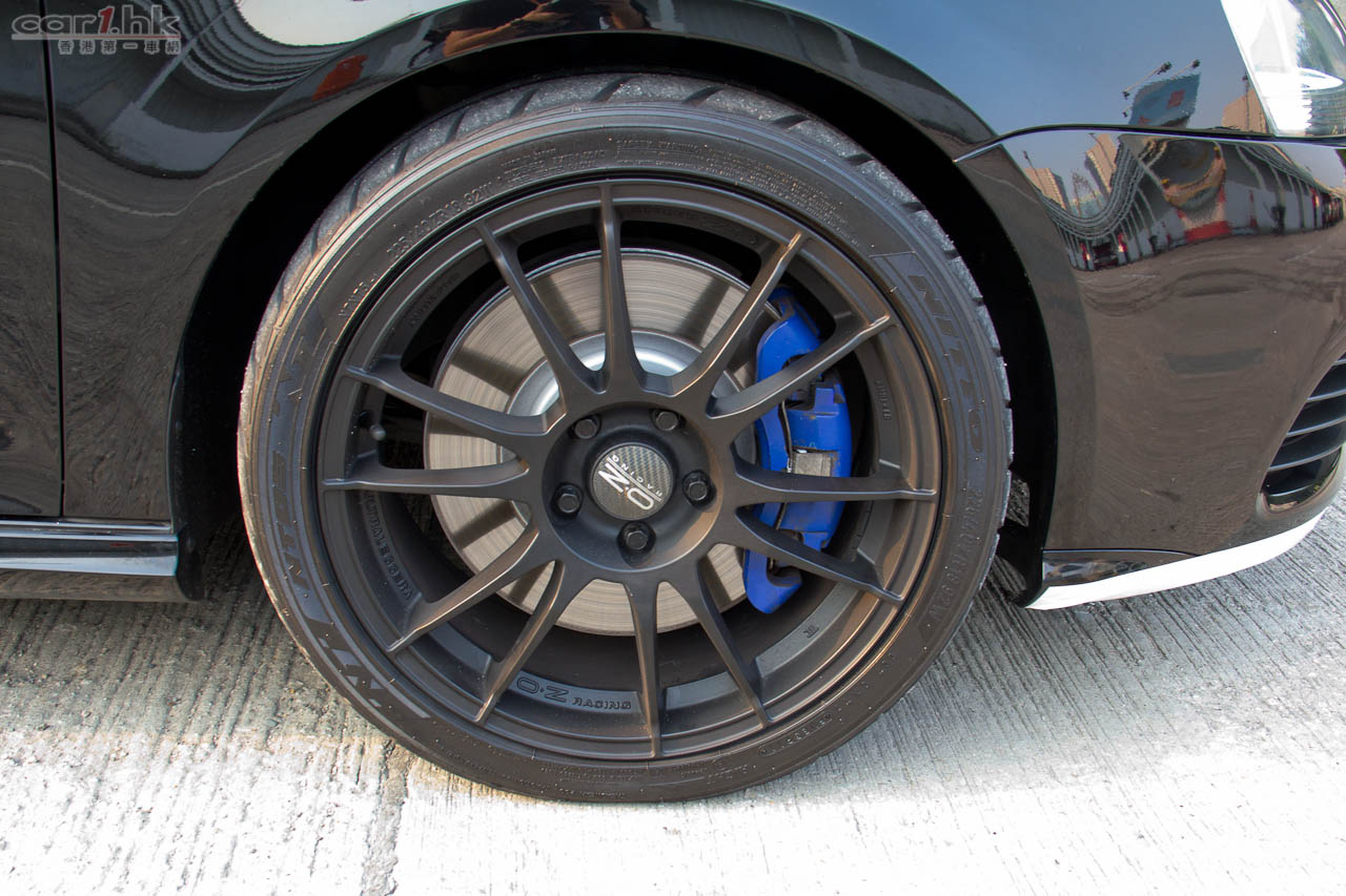 换了 OZ Racing 合金輪圈及搶眼的藍色剎車鉗。左右側鏡也改用碳纖維殼。