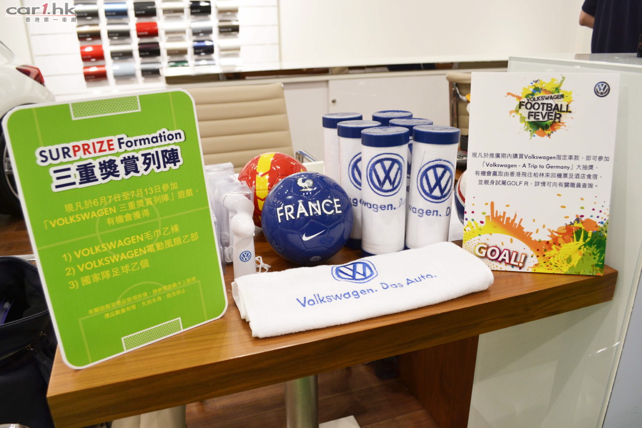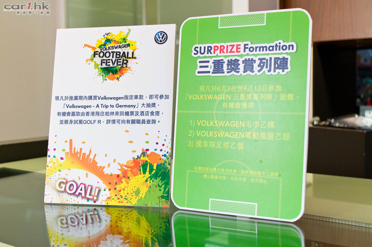 同時,Volkswagen 現正舉行「Volkswagen ─ A Trip To Germany」大抽獎活動,購買指定汽車型號包括 Beetle、Jetta、Passat 以及 Multivan 等即可獲得一次抽獎機會。選購任何一款限量版車款或是指定高性能車型包括 Golf R、Golf GTI、Golf GTI Cabriolet 以及 Scirocco 等,更可獲兩次抽獎機會。截止日期為 2014 年 7 月 14 日中午 12 時。