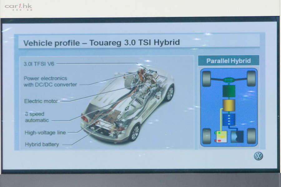 四輪驅動的Touareg Hybrid混能四驅車採用混合動力系統,行走100公里耗油量僅為8.2公升,為首部環保越野SUV。配備3公升V6 TSI 超級增壓引擎及8前速自動波箱,最大馬力達至333匹,提供卓越的越野性能。