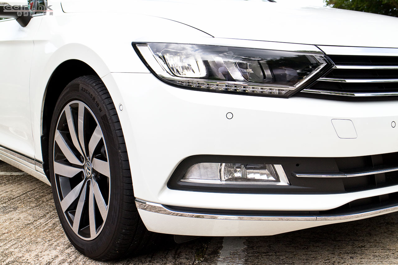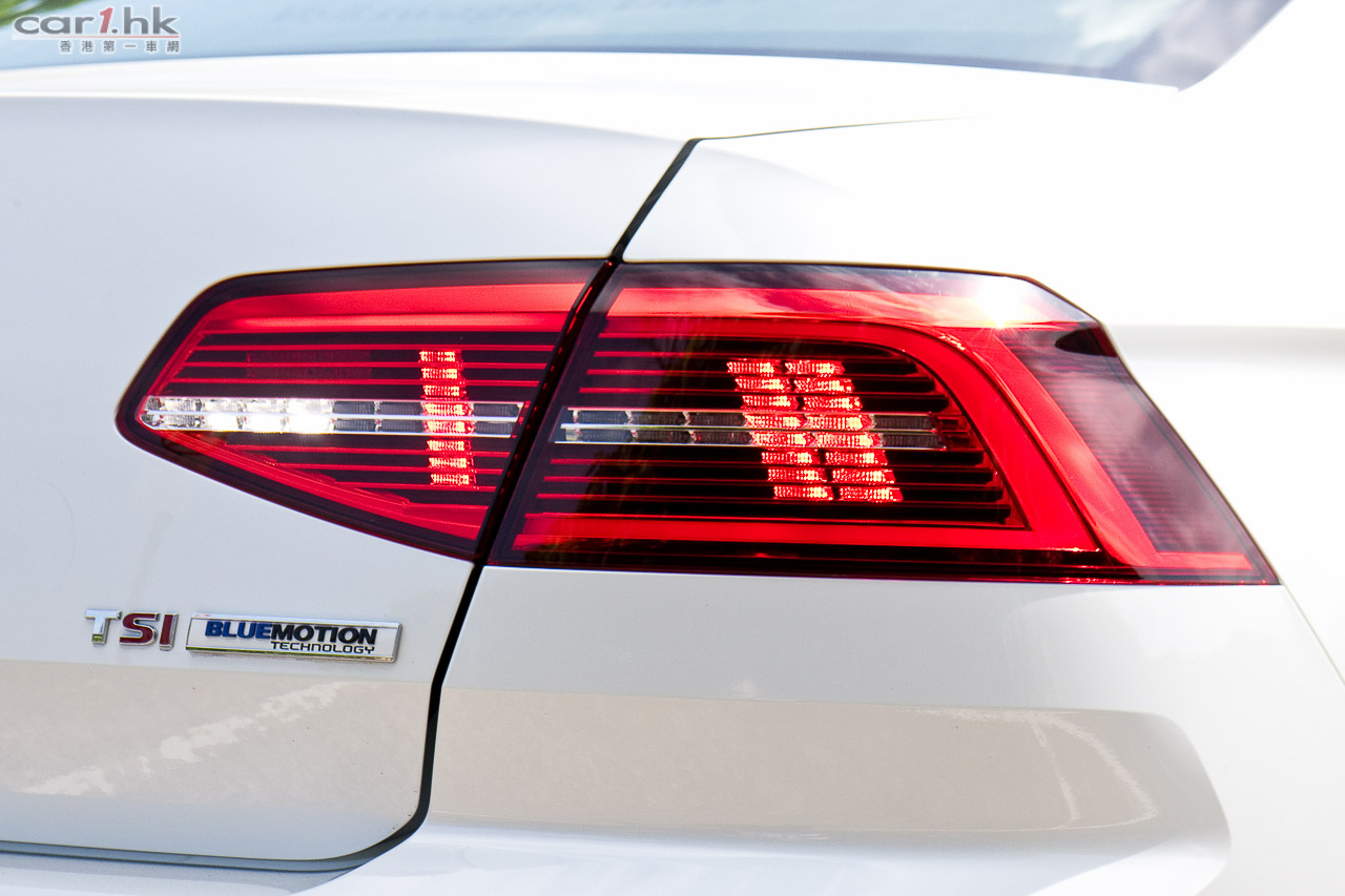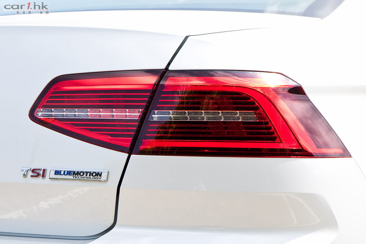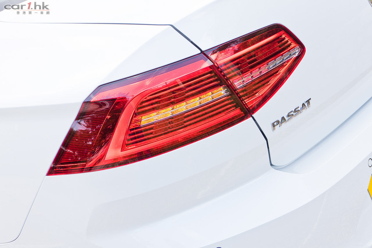 新一代 Volkswagen Passat 繼續以簡單、斯文的外型打造,在全新的 LED 頭燈(全新研發的全 LED 頭燈,採用反射技術,取代過往的Xenon照明系統)、尾燈(分為兩部分的煞車燈配備引人注目的燈光圖案)、三間電鍍鬼面罩配合下,已經輕鬆讓人分辨出新舊之別。新車車身低了、軸距長了,還用了更大的輛圈,添加了不少行政車應有的氣派。新車以 modular transverse matrix(MQB)底盤平打造,同時進行車身減磅,比上一代輕了 85 公斤,除了有助提升操控,亦對提升了慳油表現。今次試駕是 1,400cc 150 匹版本,同時廠方還有 1,800cc 180 匹版本供港。新車軸距增長了 79mm 後,令後座舒適性提升不少,尤其是在腳部空間部分,跟其他歐洲同級車難分高下。