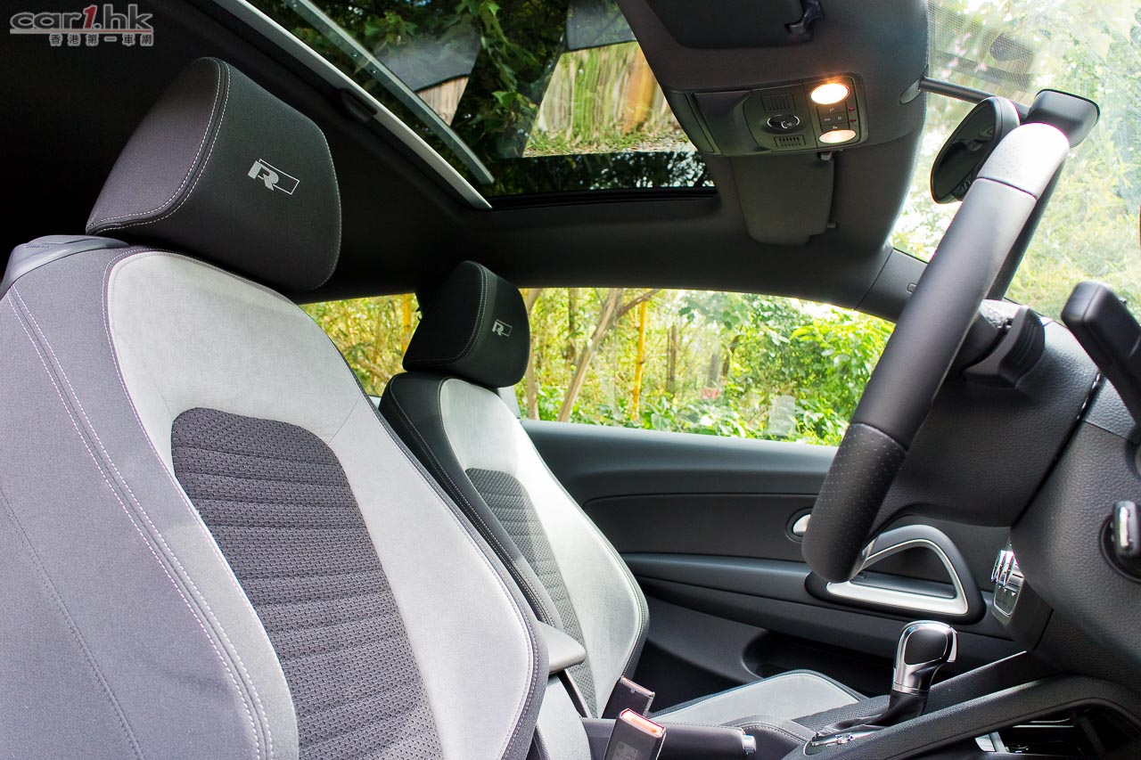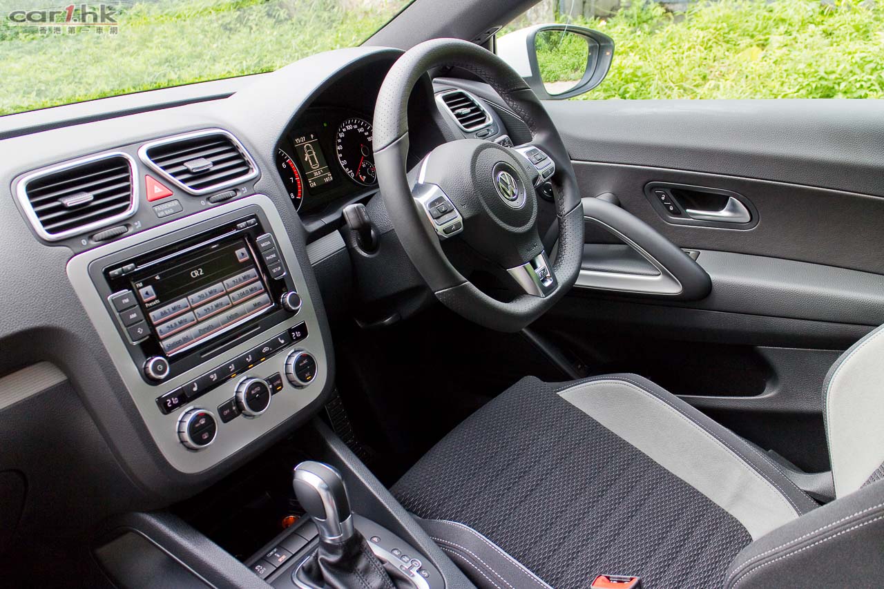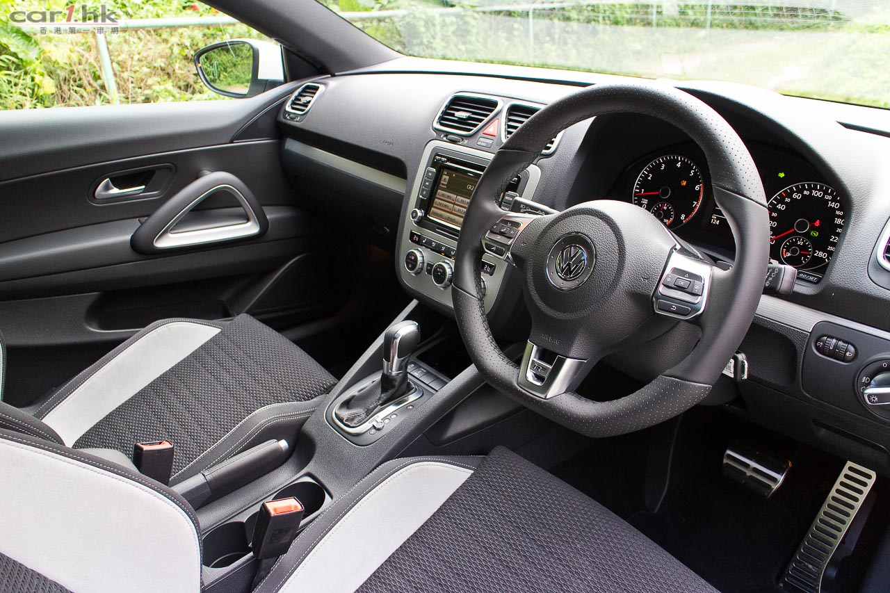 Volkswagen Scirocco 1.4 TSI R-Line 心臟未有作出改變,依然是使用 1,390cc 直四 TSI twincharger 引擎,最大馬力 160 匹和 240 牛頓米扭力。其低重心設計一直是這款車賣點,即使是 1.4 TSI 版本,廠方亦將它調校得很 Sporty,高轉轉波時很清楚聽到它的排氣聲,攻彎銳利和平穩是令人著迷賣點。而今次廠方將這部 1.4 TSI 版 Scirocco 究竟有什麼著數?車主只需了多付 $4,000 元就可以購入這部 R-Line 版。首先車身改用了 R-Line Body Kit,車身沙板貼上 R-Line 車章,門檻亦改用了 R-Line 金屬款式,很輕易找到它的不同。進入車廂後,車椅亦不同了,R-Line 灰夾黑雙色半桶車椅,包圍感不錯,頭枕位置亦印上 R-Line 圖樣。軚環方面,亦是用三幅式 R 版軚環,亦備有轉檔撥片,未有將價就貨。油門、煞車踏板亦是金屬款式,輪圈亦改為 18 吋,整體感覺比普通版更跑味。