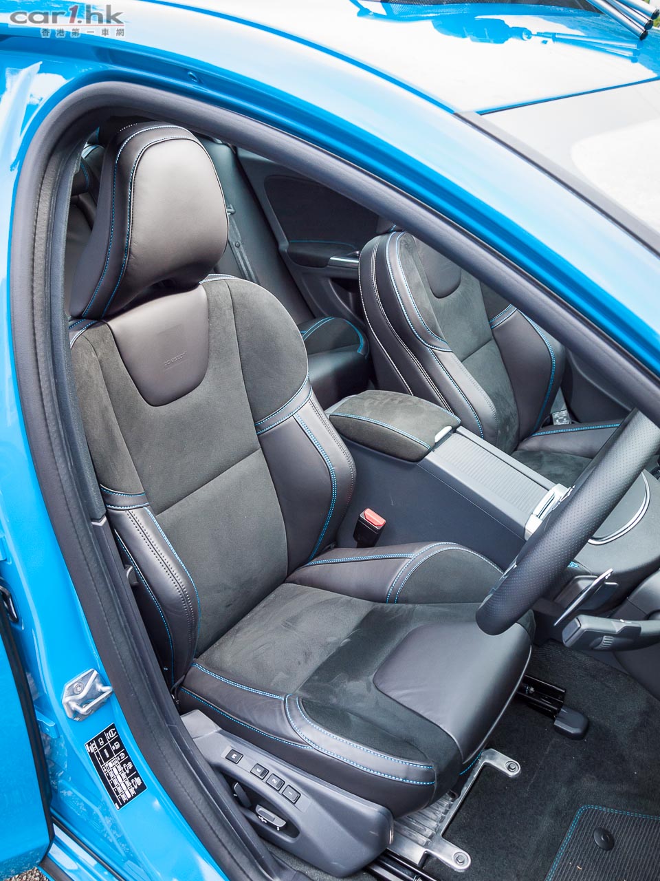 在吸睛的「反叛藍」顏色之外,S60 Polestar 被改動的地方還有「鰭翼」下唇、尾 diffuser、車側裙腳、亮黑色鬼面罩、前/後泵把裝飾和門邊鏡殼、尾箱蓋尾翼、前/後正方形淺藍色「Polestar」標誌,20 吋 Polestar 設計輪圈,輪胎由 S60 R-Design 的 235/40 R18 改大至 245/35 R20 的 Michelin Pilot Super Sport,比普通 S60 明顯「曳」得多;車身顏色另有 Onyx Black 黑、Ice White 白和 Bright Silver 銀。車廂裡有處處淺藍色縫線,方形膠粒鋁腳踏,像水晶展品的波棍頭,碳纖紋中控台飾塊,真皮混猄皮的座椅和門壁板,前座壓有「Polestar」標誌,猄皮手枕,「Engineered by… Polestar」門檻牌;「眼球」形儀錶盒和中控台顯示屏則與一般 S60 一樣。