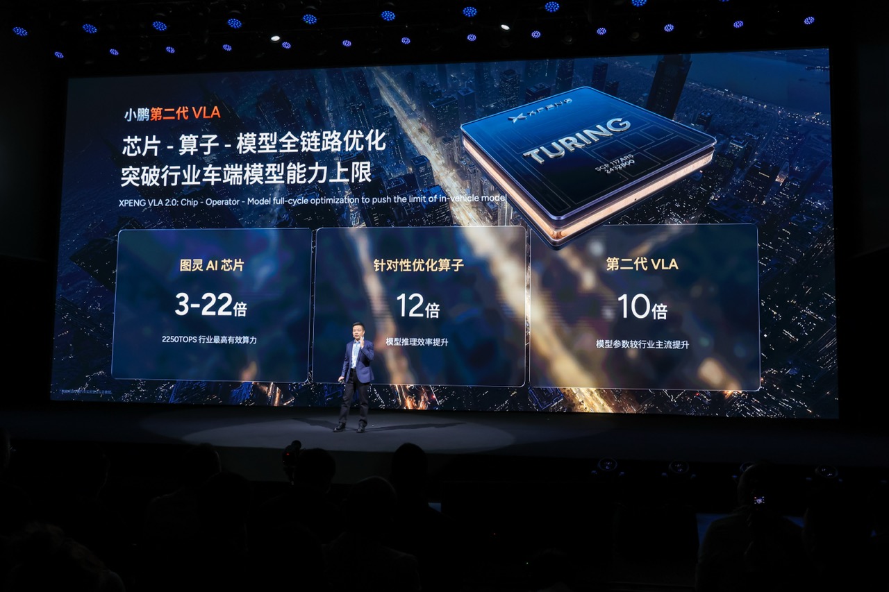 小鵬展示了第二代 VLA 大模型,是全球首個能直接以「視覺」生成「行動」的物理世界模型。以往AI要靠語言指令中轉,現在它能像人類一樣「眼見即行」,反應更快、理解更深。VLA由自研的圖靈AI晶片支撐,車端算力達到驚人的2250 TOPS,配合近1億段真實駕駛影片訓練,據稱在複雜道路的接管次數可減少13倍。這代表AI駕駛終於開始學會「感覺世界」,而非單純執行程式。