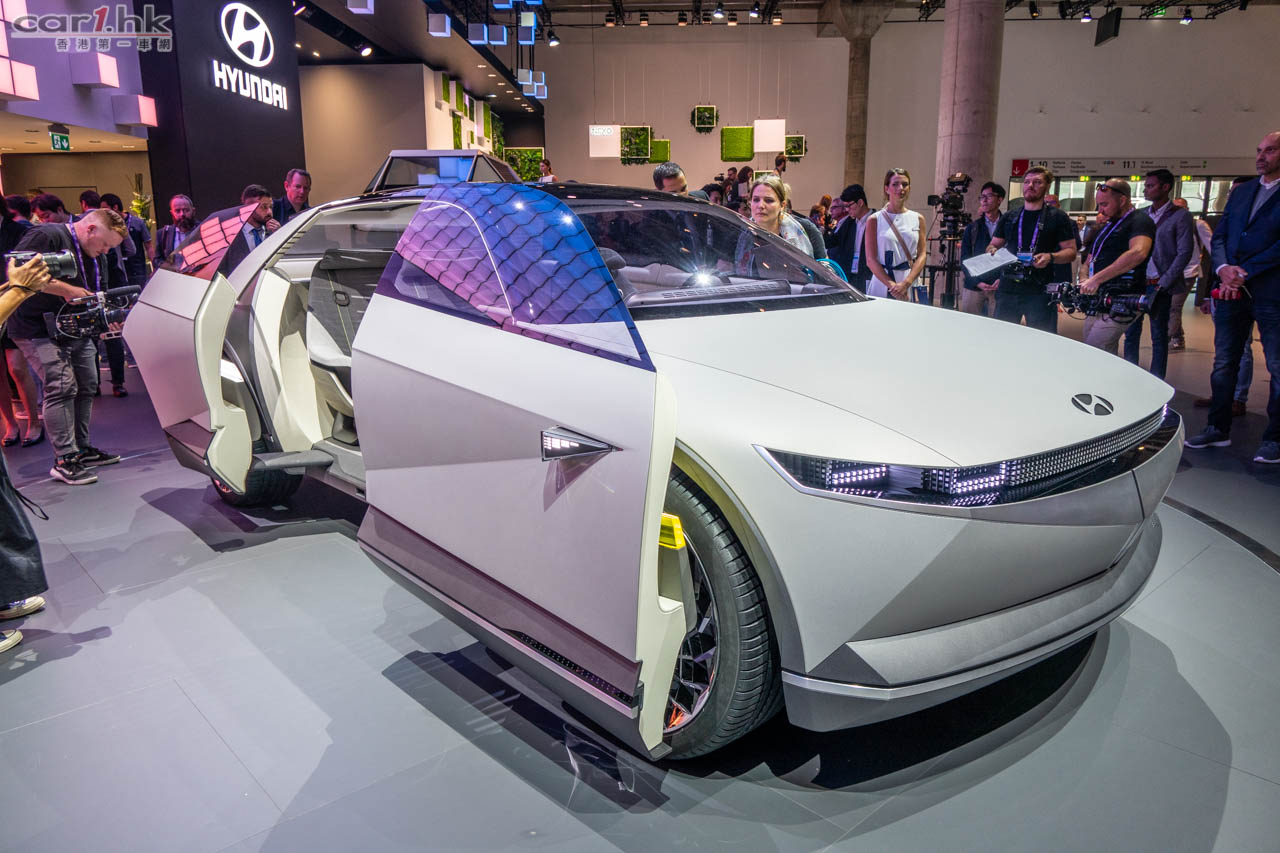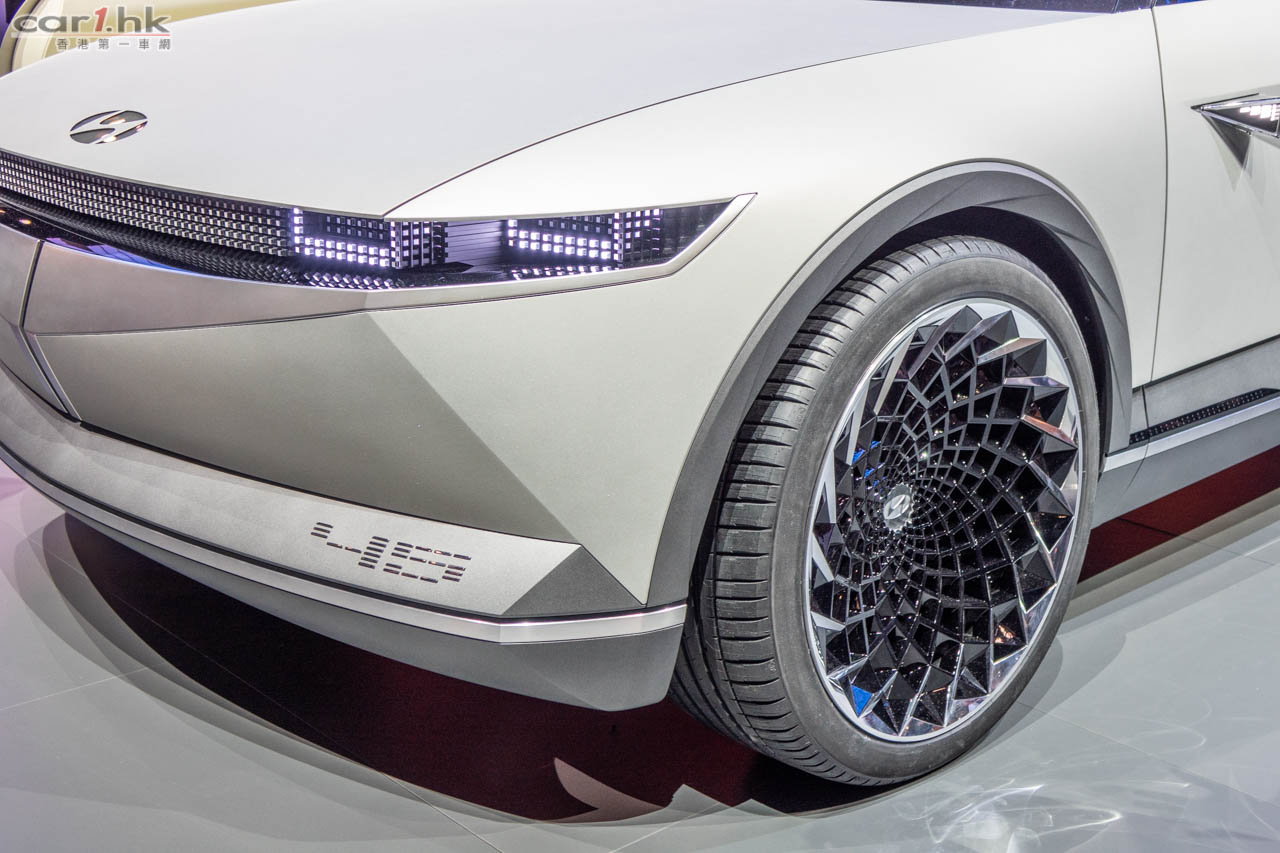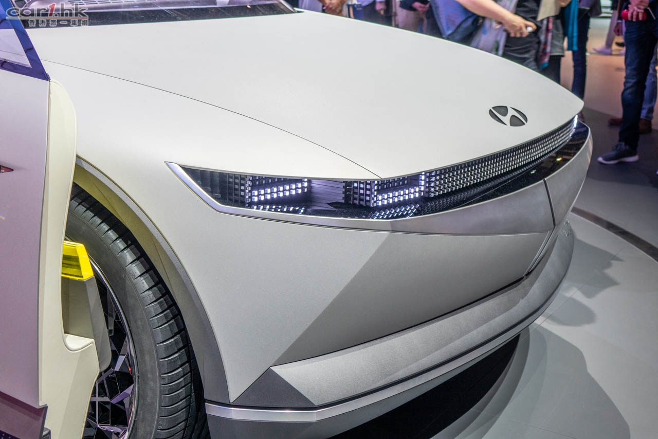 Hyundai 在法蘭克福車展正式展出 45 Concept 概念車,此車是向 45 年前的 Pony 致敬,而 45 Concept 亦是 Hyundai 未來電動車概念。它引用了 Sensuous Sportiness 設計風格,其車身水線條很流線,示範車為白色車身讓人看上去覺得很順滑。45 Concept 車體巨大,車廂空間很大,也有家居感覺。車頭車尾應用一大條陣列式 LED 作車燈設計,可以讓設計師自由運用。不過 Hyundai 沒有為這部車發出初部規格,所以其發展空間是非常大,不過我們可以在這部車看到 Hyundai 在未來會十分重視汽車的舒適性。